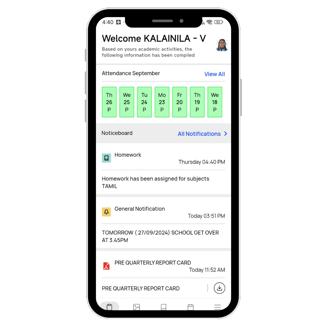The application streamlines all communication between the school and parents, providing parents with real-time updates on their child’s daily activities. Parents can access assignments, PDF notes, homework, and announcements through the School Parent App. They can also monitor their child’s attendance, make fee payments, view report cards, and more within the app.